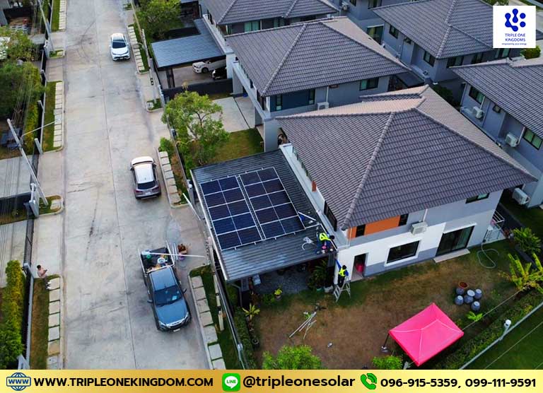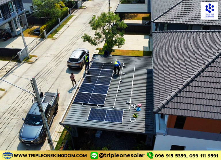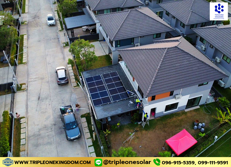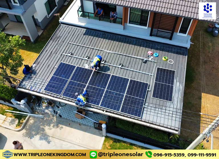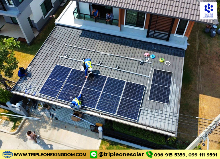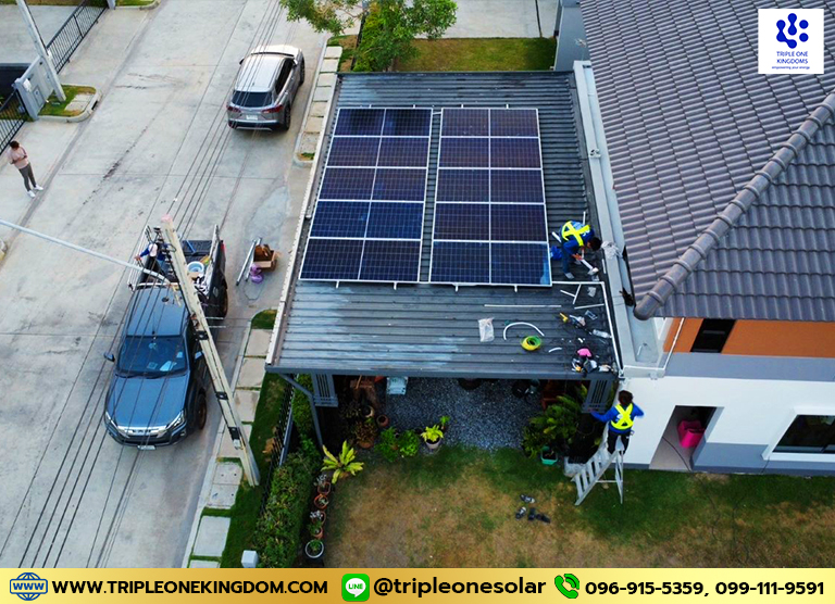 ผลงานการติดตั้งโซล่าเซลล์สำหรับ สำนักงาน หรือ บ้านพักอาศัย Solar roof / Solar rooftop โดยทีมงาน Triple One Kingdoms Co., Ltd. เรามีความชำนาญและประสบการณ์ด้านระบบไฟฟ้ามานานกว่า 40ปี การติดตั้งโซล่าเซลล์สำหรับบ้านพักอาศัยเป็นวิธีที่ได้รับความนิยมในการลดค่าไฟฟ้าและใช้พลังงานสะอาด การติดตั้งระบบโซล่าเซลล์นั้นมีทั้งแบบออนกริด (Solar On Grid) ซึ่งเชื่อมต่อกับการไฟฟ้า และแบบออฟกริด (Solar Off Grid) ที่ใช้แบตเตอรี่สำหรับเก็บไฟฟ้า และระบบ Solar Hybrid คือระบบที่พัฒนาขึ้นมาใหม่โดยรวมขอดีของทั้ง Solar On Grid กับ Off Grid กล่าวคือ ระบบมีการเชื่อมต่อกับการไฟฟ้าสำหรับช่วงที่ไม่มีแดดและมีการใช้แบตเตอรี่เพื่อเก็บพลังงานส่วนที่ผลิตเหลือในตอนกลางวันไปใช้งานในตอนกลางคืนด้วย (คล้ายๆ รถยนต์ Hybrid ที่มีการใช้พลังงานจากเครื่องยนต์และชาร์ตแบตเตอรี่ไปในขณะที่เบรค) การเลือกขนาดระบบที่เหมาะสมขึ้นอยู่กับปริมาณการใช้ไฟฟ้าของแต่ละบ้านและประเมินโดยวิศวกร โดยปกติความคุ้มค่าในการติดติดตั้งโซล่าเซลล์ ควรจะเริ่มต้นที่ 3kW ขึ้นไป