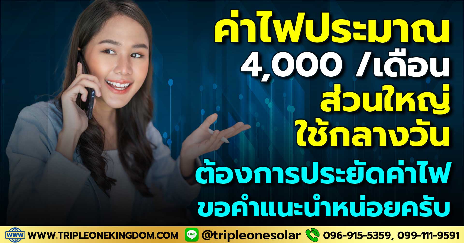 คำตอบ: จากข้อมูลคร่าวๆ ใช้ไฟฟ้าช่วงกลางวันเป็นหลัก ค่าไฟ 4,000 บาท/เดือน และปัจจุบันค่าไฟฟ้าเฉลี่ยประมาณ 4 บาท/หน่วย แสดงว่าใช้ไฟประมาณ 1,000 หน่วย/เดือน ถ้าใช้ไฟกลางวันเป็นหลัก เช่น 70-80% ของทั้งหมด ก็จะอยู่ที่ประมาณ 700-800 หน่วย/เดือน จากข้อมูลนี้จะนำไปสู่การออกแบบและเลือกระบบโซล่าเซลล์ที่เหมาะสมค่ะ
