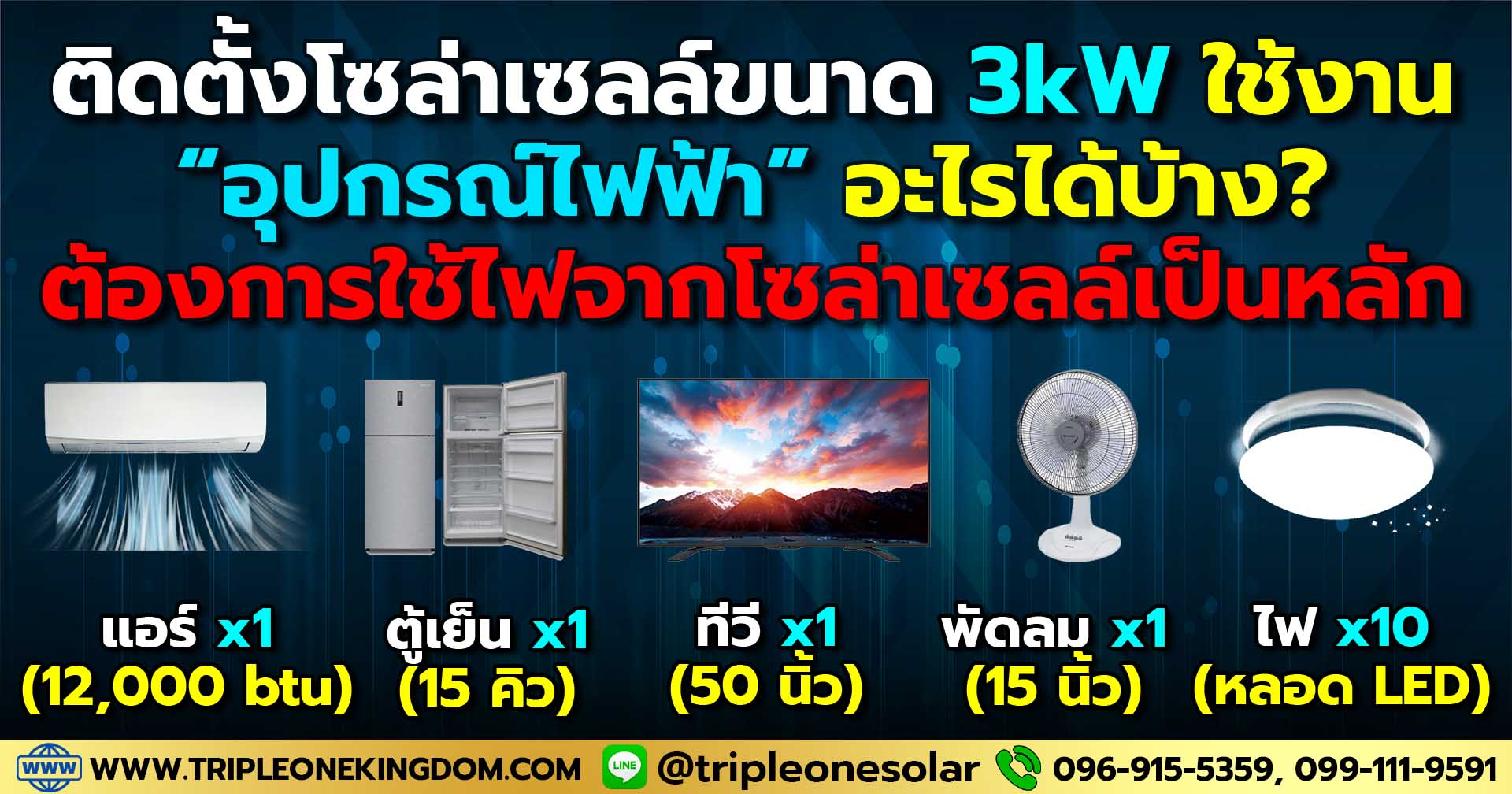 ติดตั้งโซล่าเซลล์ขนาด 3kW ใช้งานอุปกรณ์ไฟฟ้าอะไรได้บ้าง?