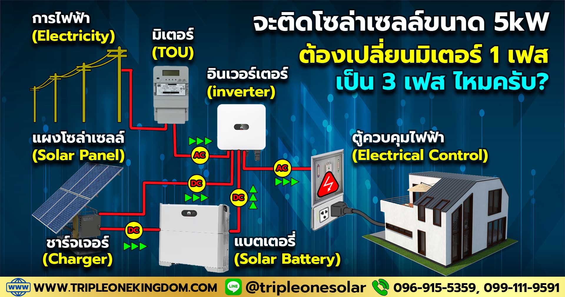จะติดโซล่าเซลล์ขนาด 5kW ต้องเปลี่ยนมิเตอร์ 1 เฟสเป็น 3เฟส ไหมครับ?